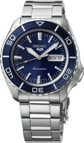 Inspired by Seiko's popular SNZH series, this stylish watch delivers all-day versatility with a cutting edge. Equipped with automatic technology that you control with every motion, this dynamic timepiece is powered by a 24-jewel movement that beats at a frequency of 21,600 vibrations per hour, with a power reserve of approximately 41 hours and manual winding capability. Framed by a navy blue uni-directional rotating bezel with a glossy Hardlex crystal insert for a refined look, the stunning blue sunray finish dial features luminous hands and markers, and a day/date calendar. Crafted of stainless steel, this tailored design includes a tri-fold push button release clasp with lock, as well as a screwdown see-through caseback for a view of classic timekeeping in action. 10 bar, 100M Water Resistant