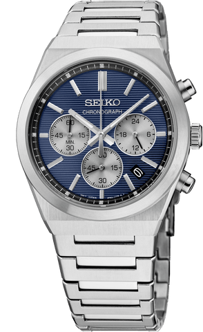 From the Essentials Collection. A modern take on a classic style, this contemporary watch features a sleek, angular case and bracelet design perfect for both dress occasions and everyday wear. The blue pressed pattern dial showcases three subdials, simple stick indices, a date calendar, and LumiBrite hands and markers. Crafted of stainless steel with a scratch-resistant sapphire crystal, this versatile timepiece is equipped with a chronograph function that measures up to 60 minutes of elapsed time in 1/5 second increments and includes a secure screwdown caseback and tri-fold push button release clasp. 10 bar, 100M Water Resistant