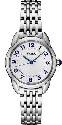 From the Essentials Collection. With elegant, jewelry-inspired styling, this gracefully updated watch features a sophisticated white dial with subtle center radial pattern, blue hands, and blue Arabic numerals for easy reading of the time at a glance. Including a classic cabochon crown, this beautifully balanced design is crafted of stainless steel and offers a tri-fold push button release clasp. 5 bar, 50M Water Resistant