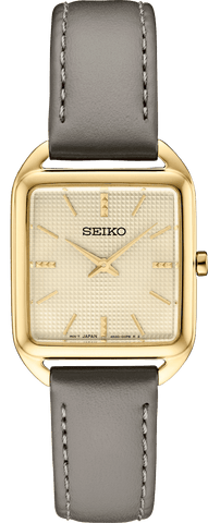 From the Essentials Collection. With a fresh square case design, this light and slim watch is proportioned for a seamless fit. The contemporary light champagne die-stamped grid pattern dial and subtly textured gold markers add a hint of sophisticated luxury. This design is crafted of stainless steel with gold finish and is paired with a gray leather strap. 5 bar, 50M Water Resistant