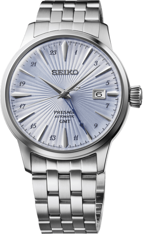 Presage Cocktail Time GMT. Offering the finest in Japanese mechanical watchmaking, the Presage Collection blends precision technology with superior craftsmanship and design. Inspired by the vibrance of the city's modern lounges, the newest Cocktail Time designs express the excitement of today's Tokyo, with fresh styling and colors. Evoking the Skydiving cocktail, the light blue dial features a deep pressed pattern with a lustrous gloss finish accented with a vibrant blue GMT hand designed in the shape of a cocktail glass, while beautifully displaying a cursive-style Arabic numeral 24-hour scale. The 24-jewel automatic GMT movement, visible through the screwdown see-through caseback, beats at a frequency of 21,600 vibrations per hour with a power reserve of approximately 41 hours. Crafted of stainless steel, this distinctive timepiece includes a date calendar, box-shaped crystal, and deployment clasp with push button release. 5 bar, 50M Water Resistant