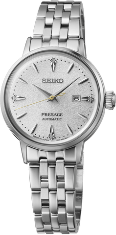 Seiko Presage Cocktail Time. Offering the finest in Japanese mechanical watchmaking, the Presage Collection blends precision technology with superior craftsmanship and design. Inspired by hot cocktails under the softer sunlight of autumn and winter, this Cocktail Time series expresses the tones and hues of the cooler seasons. Atop a stunning white pressed pattern dial evoking the Hot Buttered Rum cocktail, four diamonds, artfully incorporated into the signature markers, add a luxurious sparkle to the extraordinary design. The gracefully slender case houses a slim, 21-jewel automatic movement, which beats at a frequency of 21,600 vibrations per hour, with a power reserve of approximately 41 hours and manual winding capability. Crafted of stainless steel, this sleek timepiece includes an elegantly tapered five-row bracelet, with mirror finish for added brilliance, as well as a date calendar, box shaped crystal, and deployment clasp with push button release. 5 bar, 50M Water Resistant