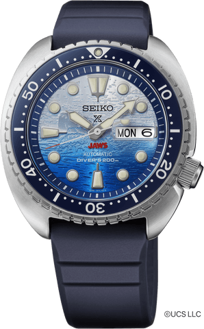 Prospex JAWS 50th Anniversary Limited Edition. Designed for those who treat life as the ultimate adventure, Seiko Prospex challenges every limit with timepieces created to exceed expectations, engineered with superior style and innovative technology for the sea, sky or land. Inspired by the iconic film, JAWS, this incredible and highly collectible Limited Edition is available only in a controlled-production run of 5,000, with the serial number and an image of the “Orca”, the boat made famous by the film and a shark’s dorsal fin engraved on each screwdown caseback. The blue and white ombre dial pattern depicts a memorable scene from the film, and the title logo, “JAWS,” is prominently displayed at the 6 o’clock position. Featuring a magnified day/date calendar and LumiBrite hands and markers, the stunning dial is framed by a navy blue ceramic uni-directional rotating elapsed timing bezel. For reliable timing in rough waters, the 24-jewel automatic movement beats at a frequency of 21,600 vibrations per hour, with a power reserve of approximately 41 hours, with manual winding capability. In stainless steel, with secure screwdown crown and caseback, anti-reflective sapphire crystal and deep blue silicone strap, this high-intensity watch is suitable for scuba diving to depths of 200m. Presented in a Limited Edition JAWS 50th Anniversary collector’s box. 200m Water Resistant