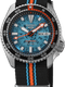 Translucent turquoise dial with red-orange and white accents