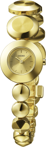 Power Design Project Limited Edition. The “Power Design Project” began in 2001 as an initiative for Seiko Watch Corporation’s designers to explore the essence of watches and pursue design possibilities in a style different from their regular work. Inspired by modern jewelry, this elegant and unique Limited Edition is styled to be perfect for both every day and special occasions. The loose-fitting construction embodies today’s fashion accessories that aim for freedom from tightness with an effortless comfort, while the asymmetrical bracelet, designed with different size links on the 12 o’clock and 6 o’clock sides, expresses the duality of one’s diverse self in both the real and virtual worlds. Featuring a clean golden dial for a monochromatic aesthetic, this sophisticated timepiece is crafted of stainless steel with gold finish and includes a deployment clasp with push-button release. 3 bar, 30M Water Resistant