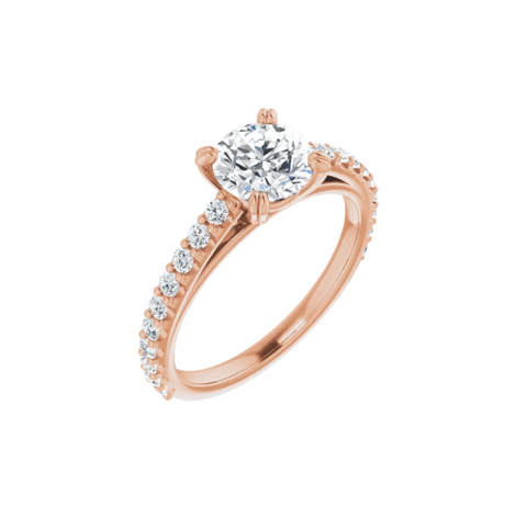 Give your lover the gift of brilliance and fire with this impeccable sidestone engagement ring from Stuller. This timeless engagement ring features old details with a modern design. Made from high-end 14k rose gold, this piece will retain its original luster for ages. With detailed metalwork in this ring's build, this band is a beautiful representation of your continued commitment. A protective setting guards your center stone from abrasions, helping to give any stone shimmer and shine. Azzi Jewelers in Ingham County are dedicated to offering customers with a plethora of engagement jewelry from the world’s foremost brands. Reach out to us above online or over the phone, or stop by to see this piece in person.