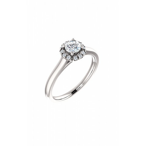 Give your lover the gift of brilliance and fire with this impeccable halo engagement ring from Stuller. This timeless engagement ring has vintage characteristics with a contemporary design. Made from high-quality 14k white gold, this engagement ring can withstand normal wear and tear for decades. With detailed metalwork in this ring's design, this engagement ring is a stunning representation of your lasting commitment. A secure setting cushions your center stone from damage, helping to give any stone shimmer and shine. Azzi Jewelers are devoted to providing customers with a plethora of engagement jewelry from the world’s leading brands. Reach out to us above online or over the phone, or stop by to see this piece in person.