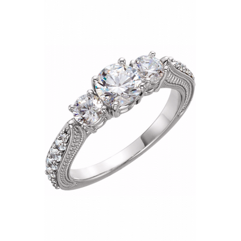 Make your proposal one for the ages with this glamorous three stone engagement ring from Stuller. This multipurpose engagement ring features heirloom characteristics with a trendy design. Made from high-quality 14k white gold, this keepsake can withstand normal wear and tear for decades. With expert metalwork in this ring's design, this band is a gorgeous representation of your commitment. A fitting setting guards your center stone from blemishes, helping to give any stone unmatched shimmer and shine. Azzi Jewelers in Lansing, Michigan are committed to providing customers with a range of luxury jewelry from today’s foremost brands. Reach out to us above online or over the phone, or stop by to see this piece in person.