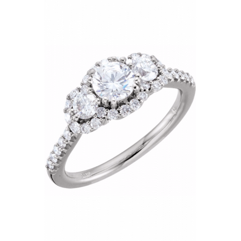 Give your lover the gift of brilliance and fire with this impeccable three stone engagement ring from Stuller. This timeless engagement ring contains old embellishments with a trendy design. Made from high-quality 14k white gold, this engagement ring will retain its original luster for ages. With masterful metalwork in this ring's design, this band is a gorgeous representation of your lasting commitment. A protective setting cushions your center stone from damage, helping to give any stone unmatched shimmer and shine. Azzi Jewelers are committed to offering customers with a variety of bridal jewelry from the world’s major brands. Reach out to us above online or over the phone, or stop by to see this piece in person.