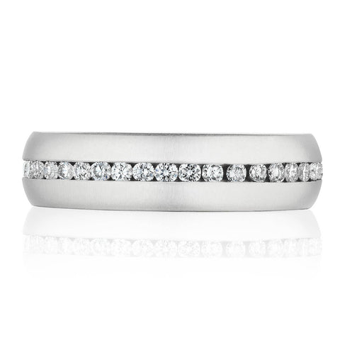 The softly-rounded exterior with a subtle satin finish is bisected with an exceptionally striking band of white, expertly channel-set solitaire diamonds. The inner face of the ring boasts a full sculpted crescent detail with a soft-comfort fit for all-day wearability.