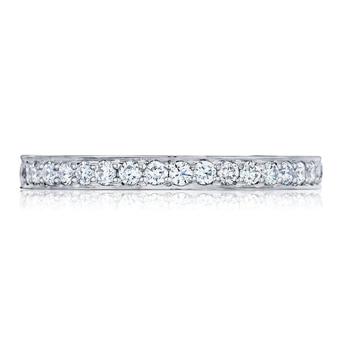 A string of pavé-set round-brilliant diamonds traces the perimeter, while a clean band of premium metal creates a contemporary aesthetic. A diamond-studded signature crescent marks the resting point of the band.The beginning of a promise of eternity for any couple is something worth symbolizing and immortalizing. This intricate and sweet wedding band from Tacori was thoroughly orchestrated just to encapsulate that wonder. Let this 18k white gold class be the seal to your feast of love. Its Milgrain, Vintage style will not fail to radiate the aura that express that just you. As glimmering as journeying on a new chapter in life are the Diamond stones that beautify the ring. These Round-shaped diamonds further bring sophistication to this detailed ring. Eternity, also available in 1/2 way throughout the ring, the stones continue to spinkle with shimmer this precious item. This wedding band for the Ladies is one exquisite and intricate piece – nothing less than what the union of two hearts should be receiving.