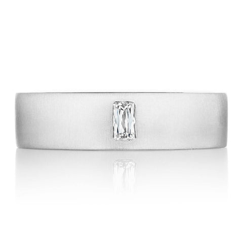 A satin exterior is accented with a Tacori-exclusive triple-cut diamond, bezel-set into the flat-top band. This simple but elegant design is complemented by full sculpted crescent detail and a soft-comfort fit interior.