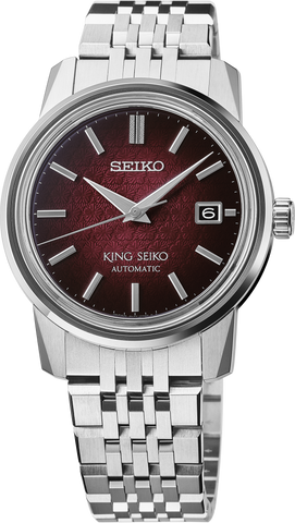 From the King Seiko Collection Re-interpretation of the sleek and innovative KSK of the 1960s Inspired by traditional Japanese Ukiyo-e art Gradated red dial with a plum tree blossom pattern Distinctive slim case design Automatic with manual winding capability Rapid date change mechanism Date calendar Diamond-cut hands Meticulously cut dimensional indices with separately carved 12 o’clock marker King Seiko crest on caseback and crown Deployment clasp with push button release