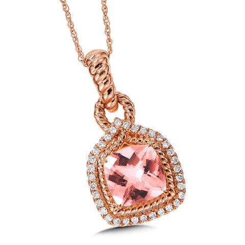 A blushing morganite pendant accented with diamonds and rope texture detailing in 14k rose gold. Cushion 7X7 mm center. Chain included.