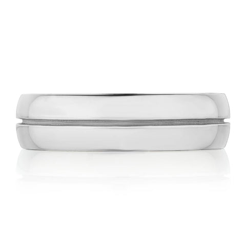 The high polish, softly-rounded exterior of this wedding band is decorated with a beveled line in in the middle for a refined silhouette. The interior features sculpted crescent detail with a soft-comfort fit for all-day wearability.