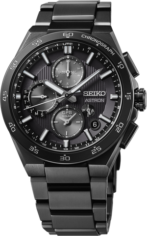 Astron GPS Solar Dual-Time Chronograph High speed GPS time and time zone adjustment (39 time zones) Perpetual day and date calendar correct to the year 2100 1/20 second chronograph with vertical subdial layout Dual time indicator and time transfer functions DST, in-flight mode, and power save functions AM/PM and signal reception result indicators Ceramic bezel insert with tachymeter Black textured dial with contrasting subdials LumiBrite hands and markers Tri-fold push button release clasp with Smart Adjuster function