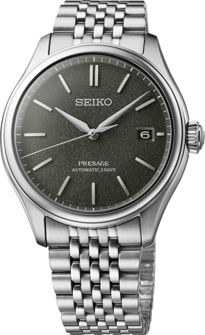 Presage Classic Series. Offering the finest in Japanese mechanical watchmaking, the Presage Collection blends precision technology with superior craftsmanship and design. The Presage Classic Series draws from the colors, materials and textures of traditional crafts, each timepiece gracefully expressing Japan’s timeless beauty. In “sensaicha”, a dark brownish-green color that was fashionable during the Edo Period, the curved dial of this streamlined design has a richly textured pattern that evokes the lustrous fabric, while capturing and reflecting ambient light to create a heightened sense of depth and beauty. Visible through the screwdown, see-through caseback, Seiko’s 6R caliber, 24-jewel automatic movement beats at a frequency of 21,600 vibrations per hour, with an exceptional power reserve of 72 hours, manual winding capability and a date calendar complication. Crafted of stainless steel, the case is constructed with smooth curved surfaces and includes a dual curved sapphire crystal, echoing the contours of the dome-shaped dial. The retro-inspired multi-row bracelet with curved top surfaces helps achieve a superbly sleek and comfortable fit and is equipped with a deployment clasp with push button release. 10 bar, 100M Water Resistant