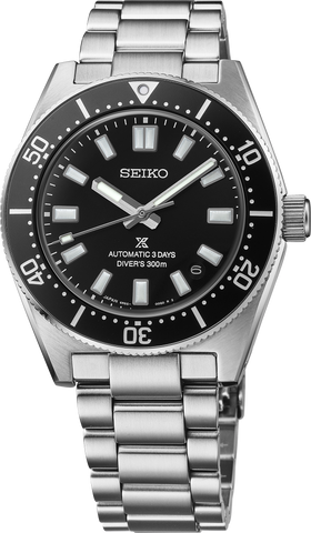 1965 Heritage Diver's Watch. Designed for those who treat life as the ultimate adventure, the Seiko Prospex collection meets every challenge with technological excellence and style. Part of a rich legacy of innovation in high-intensity timekeeping, Prospex continues to celebrate a long history of sports watch excellence with re-creations and re-interpretations of landmark achievements. Updated with more power, greater water resistance, enhanced legibility and a compact construction designed for maximum comfort, this rugged yet sleek timepiece reimagines Seiko's 1965 first diver's watch, the beginning of the company’s legacy of setting the standards in dive watch technology and design. Framed by a coordinating uni-directional rotating elapsed timing bezel, the rich black dial offers a date calendar between 4 and 5 o’clock allowing for LumiBrite coating on the hands and all 12 markers, improving symmetry and legibility. With an upgraded power reserve of approximately 72 hours, 3 full days, the 24-jewel automatic movement beats at a frequency of 21,600 vibrations per hour and includes manual winding capability. Crafted of stainless steel with super-hard coating, this superbly functional diver’s watch features a curved sapphire crystal with anti-reflective coating on the inner surface, as well as a screwdown crown and caseback. The bracelet is designed to incorporate links with a short pitch and a smaller clasp to match the sophisticated case design, which despite its slim profile, follows ISO standards for scuba diving to depths of up to 300 meters. 300m Water Resistant