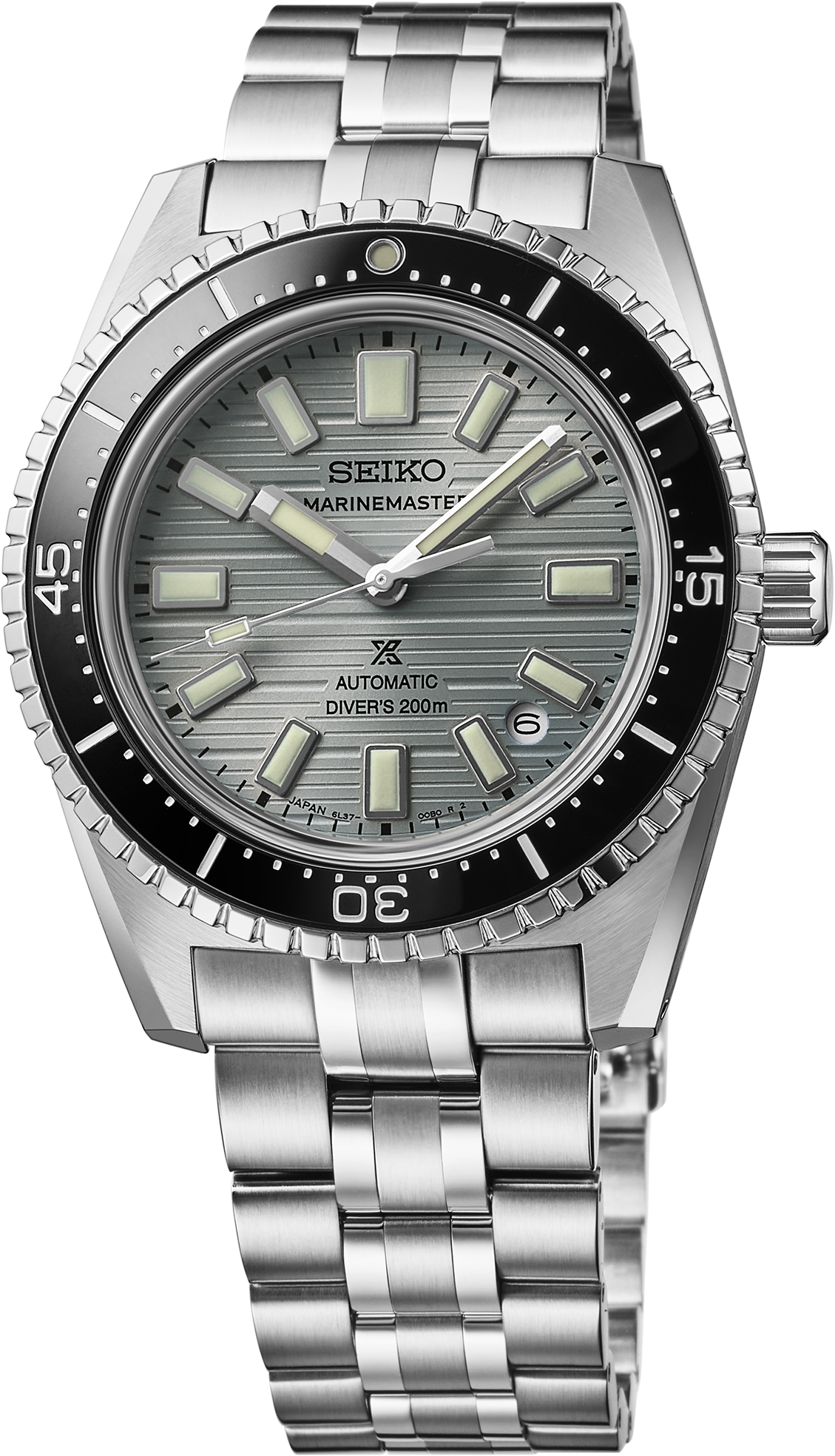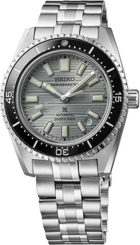 Prospex Marinemaster 1965 Heritage Diver's Watch Part of the first globally available series to bear the "Marinemaster" name Inspired by Seiko's first diver's watch from 1965 Slimline mechanical diver's watch Automatic with manual winding capability Black uni-directional rotating elapsed timing bezel Light grayish-green patterned dial LumiBrite hands and markers See-through screwdown caseback Screwdown crown Tri-fold push button release clasp with secure lock and extender Packaged in a collectors’ box