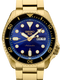 Seiko 5 Sports U.S. Special Creation. Adding new richness to classic sport/dress design, this stylish watch delivers all-day versatility with a cutting edge. Providing automatic technology that you control with every movement, this dynamic timepiece is powered by a 24-jewel movement that beats at a frequency of 21,600 vibrations per hour, with a power reserve of approximately 41 hours and manual winding capability. Framed by a gold uni-directional rotating elapsed timing bezel, the Blue dial features luminous hands and markers, and a date/day calendar. Crafted of stainless steel in gold finish, this exceptional watch includes a tri-fold push button release clasp with lock, as well as a screwdown see-through caseback for a view of classic timekeeping in action. 10 bar, 100M Water Resistant