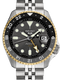Seiko 5 Sports SKX GMT U.S. Special Creation. Adding new richness to classic sport/dress design, this stylish watch delivers all-day versatility with a cutting edge. With its GMT function and stylish five-row bracelet, this dynamic watch offers a new variation on the popular "SKX" style. Equipped with automatic technology that you control with every movement, this versatile timepiece is powered by a 24-jewel movement that beats at a frequency of 21,600 vibrations per hour, with a power reserve of approximately 41 hours and manual winding capability. The first SKX design to offer a two-tone case, this exceptional watch features a charcoal gray dial with bold luminous hands and markers, and a magnified date calendar, as well as a large GMT hand with red accents for easy second time zone tracking. Crafted of stainless steel in two-tone finish, with a bi-color 24-hour GMT bezel, tri-fold push button release clasp and lock, and a screwdown see-through caseback for a view of classic timekeeping in action. 10 bar, 100M Water Resistant