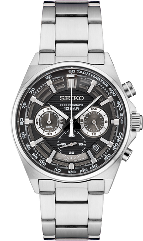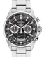 From the Essentials Collection Chronograph measures up to 60 minutes of elapsed time in 1/5-second increments Black tachymeter ring Dimensional embossed black dial with applied metallic elements and gray accents 24-hour subdial Date calendar LumiBrite hands and markers