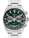 From the Essentials Collection. Inspired by racing, this rugged chronograph combines functionality and fashion for perfect sport or everyday wear. Framed by a green tachymeter outer ring, the dimensional embossed green dial features applied metallic elements and black and gray accents. Designed to suggest an engine compartment, the dial also offers three subdials, including a 24-hour indicator and a date calendar, as well as LumiBrite hands and markers. Chronograph timing provides measurement of up to 60 minutes of elapsed time in 1/5-second increments. Crafted of stainless steel, with tri-fold push button release clasp. 10 bar, 100M Water Resistant