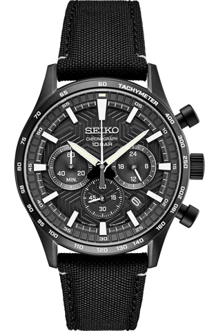 From the Essentials Collection Chronograph measures up to 60 minutes of elapsed time in 1/5-second increments Black metallic dial ring Matte black dial with y-shaped pressed pattern inspired by streetwear 24-hour subdial Date calendar LumiBrite hands and markers