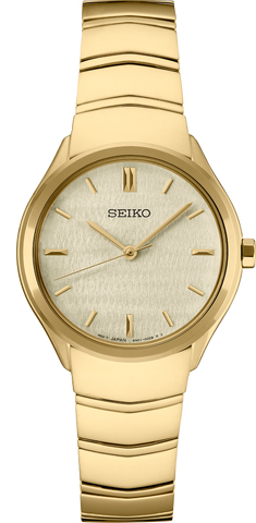 From the Essentials Collection. With sleek sophistication, this distinctively modern watch makes an immediate style statement. The clean, minimalist dial, in light champagne with simple stick markers, features a subtly varying metallic texture for added visual interest, while the soft curves of the bracelet are highlighted by a mirror and hairline finish. In stainless steel with rich gold finish, this memorable timepiece includes a tri-fold push button release clasp. 5 bar, 50M Water Resistant