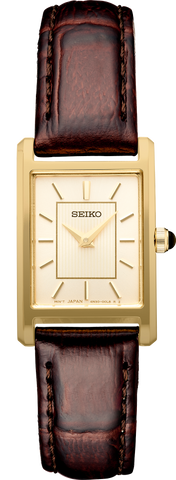 From the Essentials Collection. Offering classic dress/sport design, the Essentials Collection provides the ideal solution for everyday wear. Giving a new slant to a traditional rectangular style with a subtly patterned light champagne sunray dial, this perfectly tailored watch features a stainless steel case in gold finish, cabochon crown and textured brown leather strap. 3 bar, 30M Water Resistant