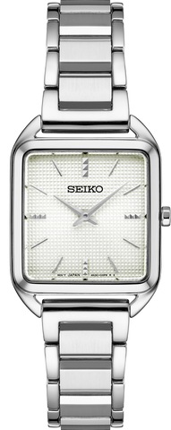 From the Essentials Collection. With a fresh square case design, this light and slim watch is proportioned for a perfect fit. The silver-white die-stamped grid pattern dial and subtly textured markers add a hint of sophisticated luxury. Crafted of stainless steel with tri-fold push button release clasp. 5 bar, 50M Water Resistant