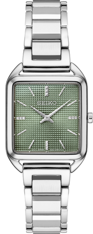 From the Essentials Collection. With a fresh square case design, this light and slim watch is proportioned for a perfect fit. The contemporary muted olive green die-stamped grid pattern dial and subtly textured markers add a hint of sophisticated luxury. Crafted of stainless steel with tri-fold push button release clasp. 5 bar, 50M Water Resistant