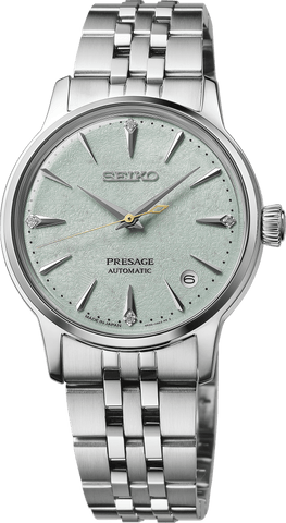 Seiko Presage Cocktail Time. Offering the finest in Japanese mechanical watchmaking, the Presage Collection blends precision technology with superior craftsmanship and design. Offering a graceful and fresh twist to the popular Cocktail Time series, this charming watch, inspired by the Frozen Mojito cocktail, features a lovely light green dial with a stunning pressed pattern evoking crunchy ice. Four diamonds, artfully incorporated into the signature wedge-shaped markers at 12,3,6, and 9 o’clock, add a luxurious sparkle. The streamlined case houses a 23-jewel automatic movement, which beats at a frequency of 21,600 vibrations per hour, with a power reserve of approximately 41 hours and manual winding capability. Crafted of stainless steel with a delicately tapered bracelet, this distinctive timepiece includes a date calendar, box-shaped crystal, screwdown caseback, and deployment clasp with push-button release. 5 bar, 50M Water Resistant