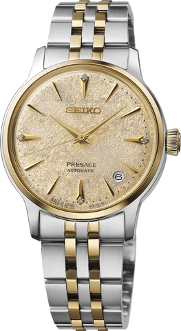 Seiko Presage Cocktail Time. Offering the finest in Japanese mechanical watchmaking, the Presage Collection blends precision technology with superior craftsmanship and design. Offering a graceful and fresh twist to the popular Cocktail Time series, this charming watch, inspired by the Frozen Banana Daiquiri cocktail, features a lovely light champagne dial. With a stunning pressed pattern evoking crunchy ice. Four diamonds, artfully incorporated into the signature wedge-shaped markers at 12,3,6, and 9 o’clock, add a luxurious sparkle. The streamlined case houses a 23-jewel automatic movement, which beats at a frequency of 21,600 vibrations per hour, with a power reserve of approximately 41 hours and manual winding capability. Crafted of stainless steel with a gold two-tone finish and a delicately tapered bracelet, this distinctive timepiece includes a date calendar, box-shaped crystal, screwdown caseback, and deployment clasp with push-button release. 5 bar, 50M Water Resistant