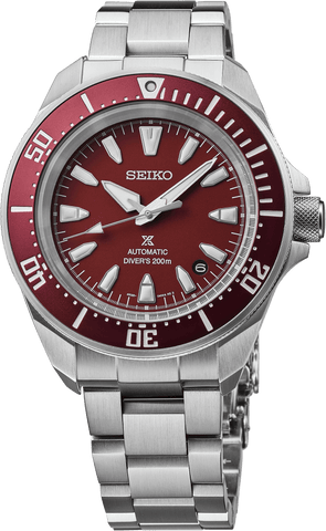 Prospex Automatic Diver. Designed for those who treat life as the ultimate adventure, the Seiko Prospex line meets every challenge with technological excellence and winning design. Inspired by Seiko's most iconic diving styles, the case retains the straight contour of the original design with a sharpness enhanced by a sleeker more compact profile. For reliable timing in rough waters, the 23-jewel automatic movement beats at a frequency of 21,600 vibrations per hour, with a power reserve of approximately 41 hours, and can be wound manually or automatically. Framed by a deep red uni-directional rotating elapsed timing bezel, the deep red dial features a date calendar and LumiBrite hands and markers. Crafted of stainless steel, this high-intensity timepiece follows ISO standards for scuba diving and is equipped with a secure screwdown crown and caseback and a tri-fold push button release clasp with secure lock and extender. 200m Water Resistant