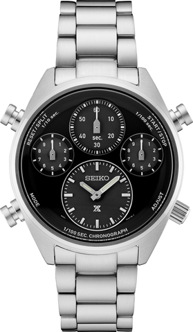 Prospex Speedtimer 1/100 Second Solar Chronograph Inspired by Seiko's - and the world’s - first analog quartz chronograph, which featured a 1/100-second stopwatch Features the new solar chronograph 8A50 movement, with precision stopwatch timing to 1/100 second, measurement up to 60 minutes of elapsed time, and a split time function Black dial with four inset black subdials, including a separate time dial LumiBrite hands and markers Concave top hammer-shaped pushers for easy stopwatch timing Screwdown caseback Tri-fold push button release clasp