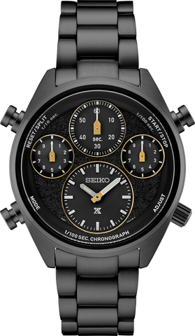 Prospex Speedtimer World Athletics Championship Budapest 2023 Limited Edition Limited Edition of 4,000, commemorating the World Athletics Championship Budapest 2023, for which Seiko is the official timer Production serial number and Budapest Championship logo engraved on caseback Inspired by Seiko's - and the world’s - first analog quartz chronograph, which featured a 1/100-second stopwatch Features the new solar chronograph 8A50 movement, with precision stopwatch timing to 1/100 second, measurement up to 60 minutes of elapsed time, and a split time function Patterned black dial styled to suggest professional running track surfaces Four inset black subdials, including a separate time dial Gold chronograph hands symbolizing the highest level of athletic achievement LumiBrite hands and markers Concave top hammer-shaped pushers for easy stopwatch timing Screwdown caseback Tri-fold push button release clasp