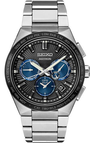 Astron GPS Solar 5-X Titanium Dual Time Collection. With the strong, sleek lines of the Seiko Astron, the world's first commercially available quartz watch, today's Astron is designed for a new generation of leaders, embodying the pursuit of excellence in both innovation and style. Combining solid tailoring with the highest degree of accuracy possible in a wristwatch, this exceptional timepiece is GPS controlled for high-speed time and time zone adjustment to 39 time zones, and includes a daylight saving time function, perpetual day and date calendar correct to the year 2100, and am/pm indicators. The unique time transfer function allows wearers to switch between the main dial time and the dual time subdial at the push of a button. To ensure smooth operation, the watch is equipped with a signal reception result indicator and power save function. The solar cell is powered by light energy, with no battery change required. Featuring three-dimensional applied indices and LumiBrite hands and markers for superior visibility, the black dial, with sunray pressed pattern and three contrasting blue subdials, is framed by a black ceramic world time bezel providing subtle dimensionality, shine and enhanced scratch-resistance. Crafted of light and durable titanium, with a super-hard coating for added endurance and H-shaped links for smooth wearing comfort, this superb timepiece also offers a sapphire crystal with super-clear coating, secure screwdown caseback and tri-fold push button release clasp. 10 bar, 100M Water Resistant
