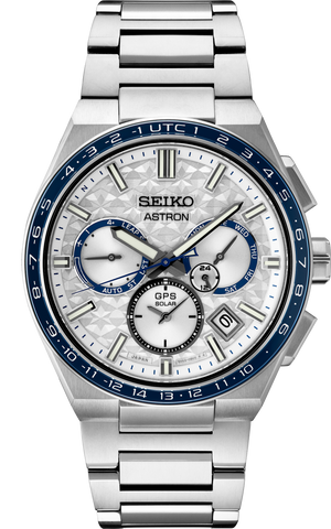 Astron GPS Solar Limited Edition Limited Edition of 1,200 Production serial number engraved on caseback GPS Solar Dual Time Perpetual day and date calendar correct to the year 2100 High speed GPS dual time and time zone adjustment Dual time indicator (39 time zones) Time transfer function AM/PM indicator Daylight saving time function Power save function Blue sapphire crystal bezel insert with white accents Silver pressed pattern dial with blue accents Dual time, day, 24-hour and multi-function indicator subdials Date calendar LumiBrite hands and markers Screwdown caseback Tri-fold push button release clasp Packaged in a Limited Edition collectors’ box in a matching color scheme