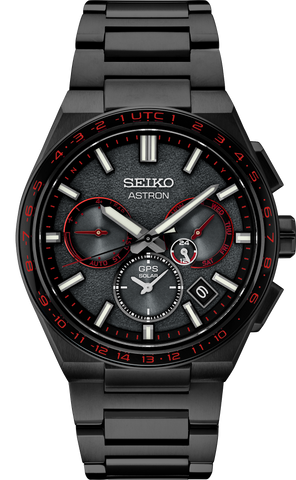 Astron GPS Solar Limited Edition Limited Edition of 1,200 Production serial number engraved on caseback GPS Solar Dual Time Perpetual day and date calendar correct to the year 2100 High speed GPS dual time and time zone adjustment Dual time indicator (39 time zones) Time transfer function AM/PM indicator Daylight saving time function Power save function Black sapphire crystal bezel insert with red accents Black pressed pattern dial with red accents Dual time, day, 24-hour and multi-function indicator subdials Date calendar LumiBrite hands and markers Screwdown caseback Tri-fold push button release clasp Packaged in a Limited Edition collectors’ box in a matching color scheme
