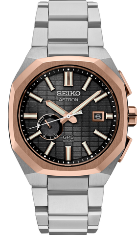 Astron GPS Solar. With the strong, sleek lines of the Seiko Astron, the world’s first commercially available quartz watch, today’s Astron is designed for a new generation of leaders, breaking through to the future with excellence in both innovation and style. Strong and distinctive, with its perfectly sculpted octagonal titanium bezel in rose gold finish, this dynamic timepiece combines solid tailoring with the highest degree of accuracy possible in a wristwatch. Powered by Seiko’s new GPS solar caliber 3X62, with the improved receiver sensitivity required by the metallic bezel, this exceptional watch is GPS controlled for high-speed time and time zone adjustment to 39 time zones, and includes an in-flight mode and perpetual date calendar correct to the year 2100. To ensure smooth operation, the watch is equipped with a signal reception result indicator and power save function. The solar cell is powered by light energy, with no battery change required. With a new pressed pattern inspired by crystals in homage to the original quartz Astron, the black dial features a multi-function indicator subdial for easy mode reference, as well as rose gold accents, sharp and highly visible three-dimensional applied indices, and LumiBrite hands and markers. Crafted of light and durable titanium, with rose gold-finish bezel and crown, and a super-hard coating for added endurance, this superb timepiece also offers a sapphire crystal with super-clear coating, secure screwdown caseback and tri-fold push button release clasp with smart-adjuster function. 10 bar, 100M Water Resistant