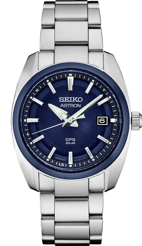 From the Astron Collection Solar GPS controlled for high-speed time and time zone adjustment Blue dial with date calendar and LumiBrite hands and markers Blue ceramic bezel Screwdown caseback Tri-fold push button release clasp