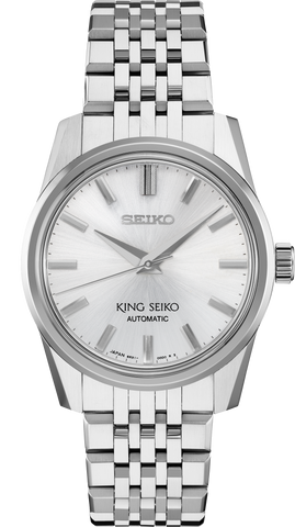 King Seiko Modern Re-Interpretation King Seiko crest on caseback and crown Distinctive slim case design Automatic with manual winding capability Silver brushed-pattern dial Silver dial ring Tri-fold push button release clasp Meticulously cut three-dimensional indices with separately carved 12 o'clock marker Re-interpretation of the sleek and innovative King Seiko of the 1960s