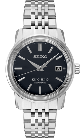 From the King Seiko Collection Re-interpretation of the sleek and innovative King Seiko of the 1960s King Seiko crest on caseback and crown Distinctive slim case design Automatic with manual winding capability Rapid date change mechanism Black dial with blue tint Date calendar Diamond-cut hands Meticulously cut dimensional indices with separately carved 12 o’clock marker Deployment clasp with push button release