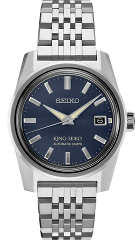 From the King Seiko Collection Re-interpretation of the sleek and innovative King Seiko of the 1960s King Seiko crest on caseback and crown Automatic with manual winding capability Retro aged blue dial with vertical hairline finish and metallic texture Date calendar LumiBrite hands and markers Bracelet endpiece includes two levers for easy removal Deployment clasp with push button release