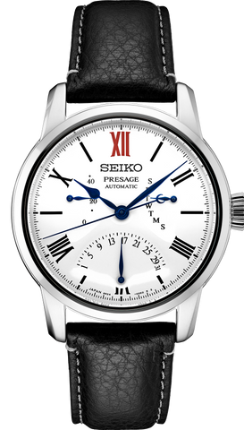 Presage Craftsmanship Series Seiko Watchmaking 110th Anniversary Enamel Dial Limited Edition. To mark 110 years of watchmaking excellence, Seiko is highlighting its continuous dedication to evolving technology, as well as diversity, equality and the sustainable manufacturing necessary to meet environmental challenges. Part of a collection celebrating traditional Japanese crafts, this exquisite Limited Edition, available only in a controlled-production run of 1,500, with the serial number engraved on each caseback, extends the Presage tradition of blending precision technology with superior craftsmanship and design, offering the finest in Japanese mechanical watchmaking with a uniquely Japanese sense of beauty. Honoring enamel artistry, this elegant watch features a hand-crafted pure white enamel dial, ensuring a long-lasting finish while echoing the dial of the 1913 Laurel, Seiko’s – and Japan’s – first wristwatch. Created by master craftsman Mitsuru Yokosawa, the dial expresses gratitude to our predecessors, featuring a red roman numeral at 12 o’clock like the original Laurel and a new design with alternating Roman numerals and indices, as well as both day and date retrograde subdials, and a power reserve indicator. Visible through the screwdown, see-through caseback, the 31-jewel automatic movement beats at a frequency of 28,800 vibrations per hour, with a power reserve of approximately 45 hours and manual winding capability. In stainless steel, with super-hard coating and a new refined and beautifully proportioned case shape, this exceptional design includes a dual-curved anti-reflective sapphire crystal. tri-fold push button release clasp, and a black sustainable leather strap, certified by the Leather Working Group (LWG). Packaged in a Limited Edition collectors’ box. 10 bar, 100M Water Resistant
