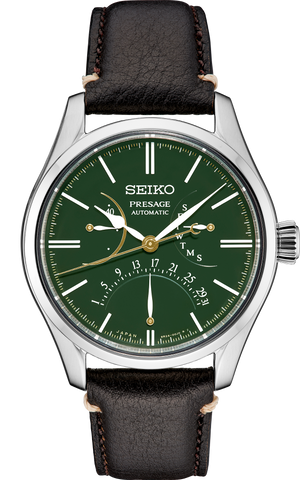 Presage Craftsmanship Series Urushi Lacquer Limited Edition Limited edition of 2.000 Fine mechanical watchmaking from Japan Automatic with manual winding capability Retrograde day and date subdials Power reserve indicator with gold accents Screwdown see-through caseback Stainless steel case Dark brown buffalo leather strap Tri-fold push button release clasp Deep green lacquer dial celebrating the lush foliage and moss of summer in Kanazawa, the Honshu Island city famed for craftsmanship and home to its master artisan creator