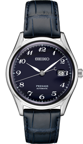 Presage Enamel Collection. Offering the finest in Japanese mechanical watchmaking, the Presage Collection blends precision technology with superior craftsmanship and design. Created by master craftsmen trained in the painstaking, multi-stage process of fine enamelwork, Presage enamel dials showcase the unique brilliance and depth of enamel artistry. The rich blue dial of this elegant design features white numerals and a date calendar, and is topped by a box-shaped sapphire crystal with anti-reflective coating on the inner surface. The screwdown see-through caseback provides a view of the 26-jewel automatic movement with manual winding capability, a frequency of 28,800 vibrations per hour and a power reserve of approximately 45 hours. With a thinner, sleeker caliber, this sophisticated timepiece is crafted of stainless steel with blue crocodile strap and tri-fold push button release clasp, and comes with an additional cordovan leather strap. 3 bar, 30M Water Resistant
