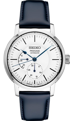 From the Presage Collection. Offering the finest in Japanese mechanical watchmaking, the Presage Collection blends precision technology with superior craftsmanship and design. A tribute to the famed modernist clock design of Riki Watanabe and the craftsmanship of enamelwork masters, this sophisticated watch highlights a range of Japanese artistic achievement, from intricate ancient traditions to masterful contemporary minimalism. The clean white dial, with power reserve indicator and calendar subdial, showcases both the unique depth of fine enamel and the simplicity of Watanabe's bar indices and distinctive hands. A screwdown see-through caseback provides a view of the 29-jewel automatic movement with manual winding capability, a frequency of 28,800 vibrations per hour and a power reserve of approximately 45 hours. Featuring a dual-curved anti-reflective sapphire crystal, this elegant design is crafted of stainless steel with a sleek blue cordovan leather strap and tri-fold push button release clasp. 10 bar, 100M Water Resistant.