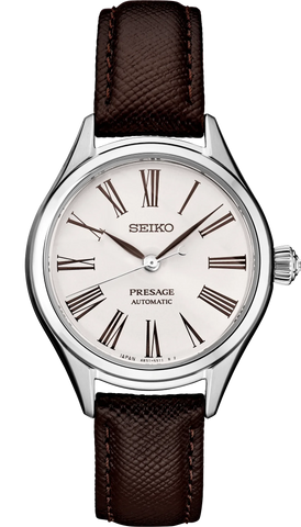 Presage Ladies' Enamel. Offering the finest in Japanese mechanical watchmaking, the Presage Collection blends precision technology with superior craftsmanship and design. From a collection dedicated to the theme of Eternal Beauty, this graceful timepiece, with its streamlined silhouette and sparkling diamond cabochon crown, features a hand-crafted enamel dial, uninterrupted by subdials or inserts, in a pale Sakura pink reminiscent of cherry blossoms. The slim 24-jewel automatic movement beats at a frequency of 21,600 vibrations per hour with a power reserve of approximately 70 hours and offers manual winding capability. Crafted of stainless steel, this exquisite watch includes a dual-curved anti-reflective sapphire crystal, brown textured calfskin strap and tri-fold push-button release clasp. 5 bar, 50M Water Resistant